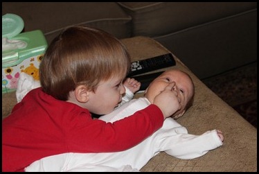 Campbell LOVES to point out all of Larkins facial features. We have to really watch him on the eyes! Ha! Soooooo sweet. I love when Campbell loves on Larkin.
